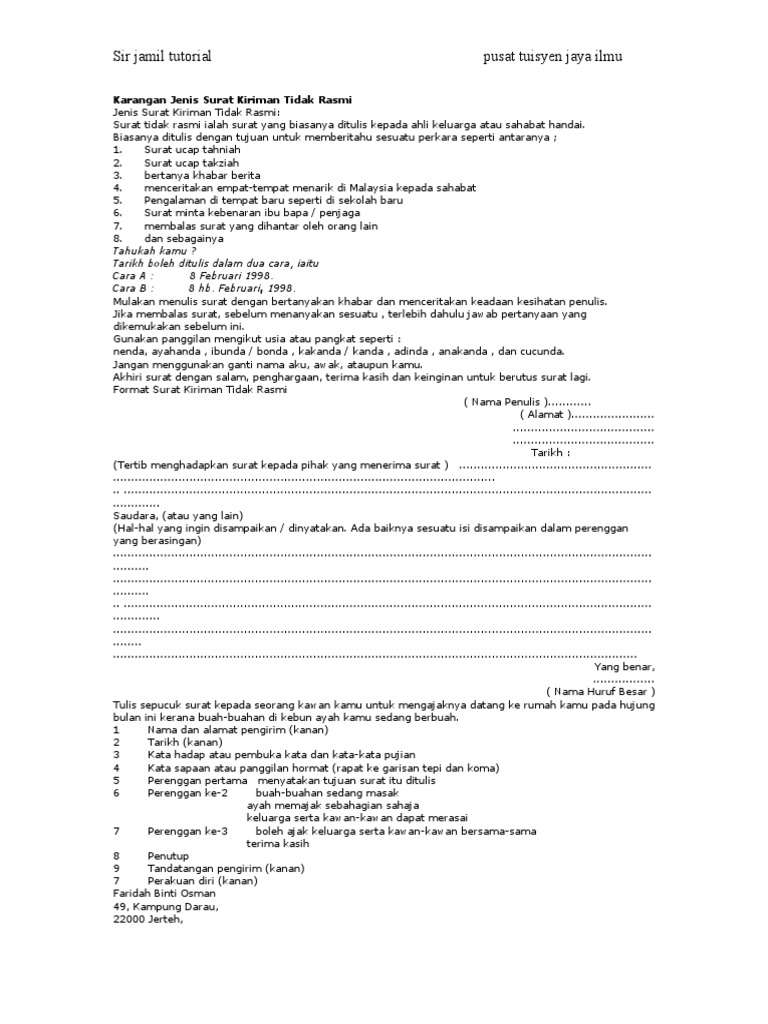 Related : Contoh Karangan Surat Kiriman Rasmi : Berikut dikongsikan cara menulis surat dan contoh surat kiriman tidak rasmi..