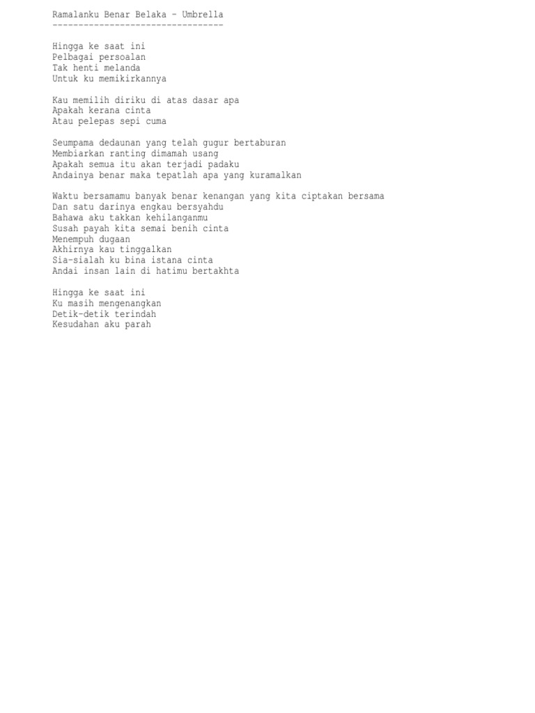 Umbrella Ramalanku Benar Belaka Lirik Koleksi Lirik Lagu Melayu Dan Inggeris from 4.bp.blogspot.com Andainya benar maka tepatlah apa yang kuramalkan. By planetlagu on may 7, 2021. Andainya benar maka tepatlah apa yang kuramalkan. Kau memilih diriku di atas dasar apa apakah kerana cinta atau pelepas sepi cuma. Kau memilih diriku di atas dasar apa apakah kerna cinta atau pelepas sepi cuma. Hak asasi dalam perlembagaan malaysia; Di dalam suasana hari raya. Apalah dosa hingga kau didera.
